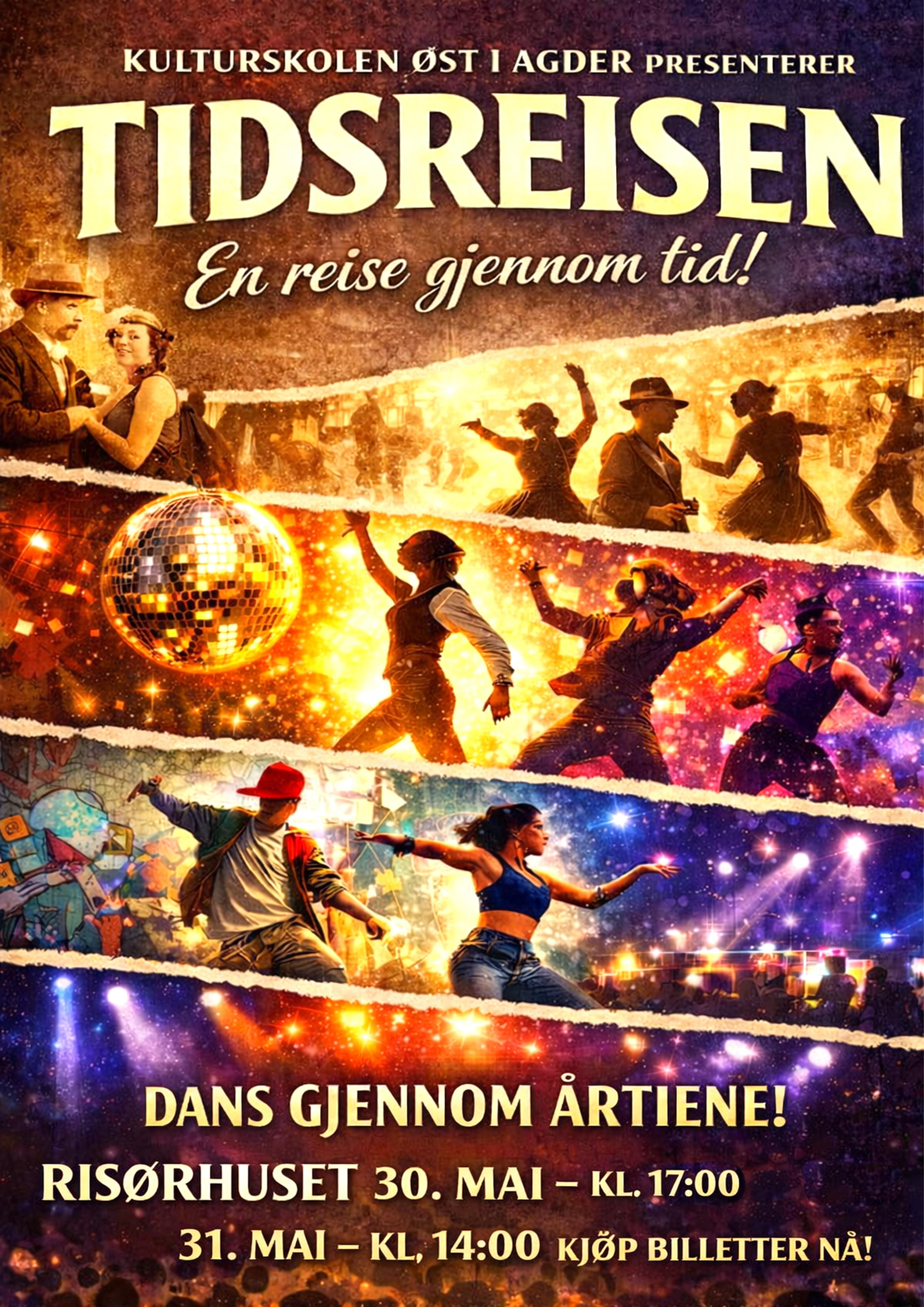 Kulturskolen Øst i Agder presenterer Tidsreisen – en storslått danseforestilling med over 70 barn og unge dansere i alderen 4–18 år. Her får du oppleve energi, uttrykk og danseglede i et fargesprakende show fylt med ikonisk musikk, sterke øyeblikk og ekte scenemagi.